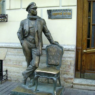 Установлен бронзовый сын турецкоподданого, который напоминает молоденького Юрковского, замечательный памятни Остапу у ресторана Золотой Остап в Санкт-Петербурге. И, что самое главное, он как всегда в своей знаменитой фуражке и модном шарфе, стоит, облокотившись на стул. Под мышкой у него папка
